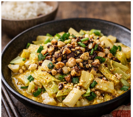 - Mit dem gerösteten Sesam, optional geschnittenen Frühlingszwiebeln und Koriander servieren.